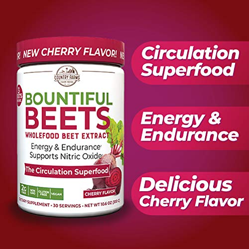 Farm Fresh 3 Beets Per Svg.The Circulation SuperfoodEnergy & EnduranceSupports Nitric Oxide2 g FiberNon-GMOGluten-FreeVeganDietary Supplement30 ServingsCardiovascular HealthMaximum Enduranceimmunity BoosterAntioxidantCountry Farms Beets, the circulation superfood brings the power of pure beets to life in a delicious and convenient drink mix. Now in delicious cherry flavor, beets nutrient profile is full of antioxidants, potassium and essential minerals to help boost the body’s natural production of nitric oxide. To increase your daily intake of beets, incorporate easy-to-mix beets powder into your daily nutrition regimen.