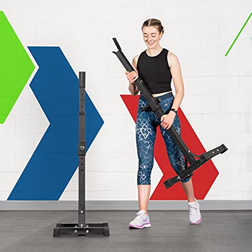 SAFETY SQUAT STAND – The stand frame features strong spotter arms designed to catch barbells dropped during squats for increased safety during your barbell bench & squat workout.